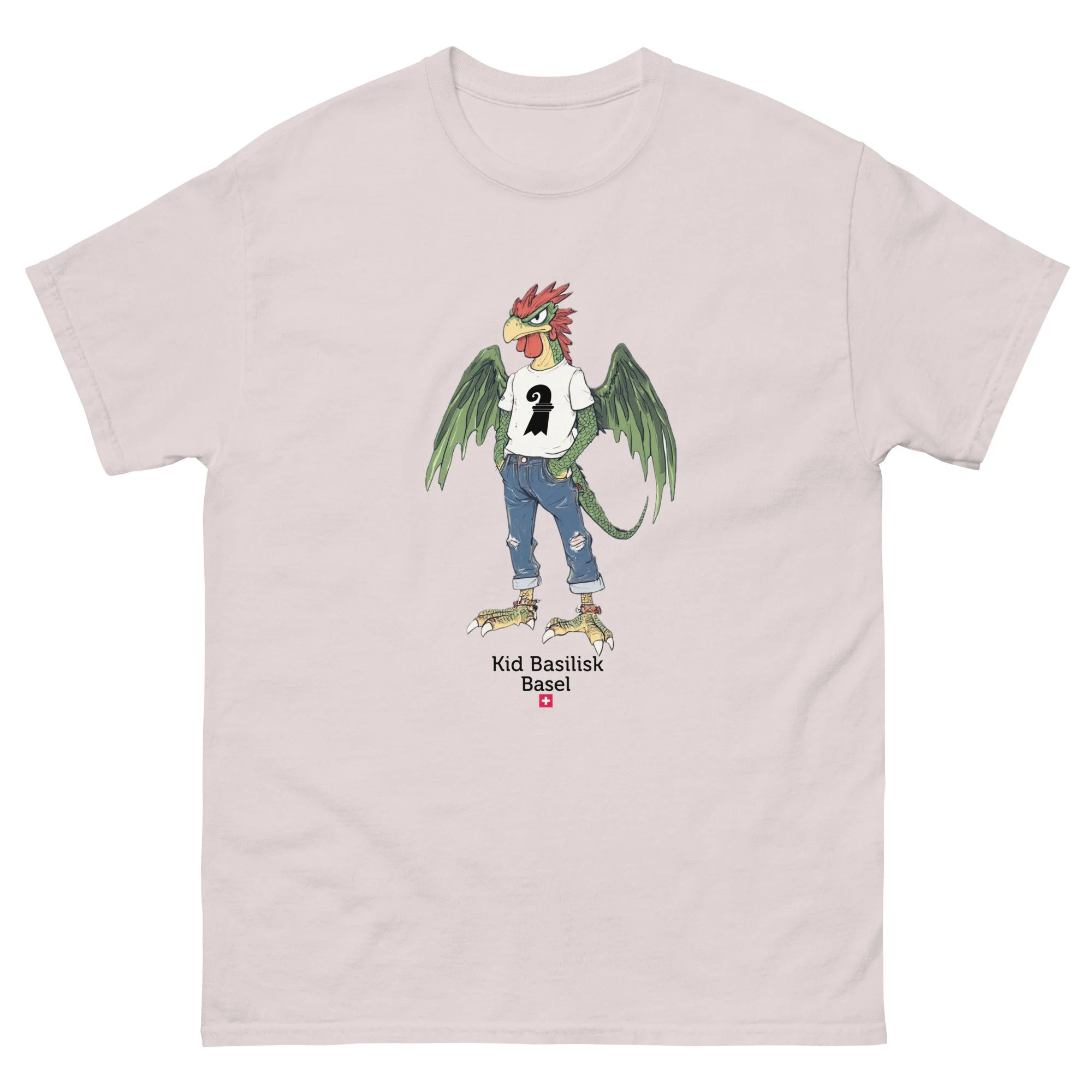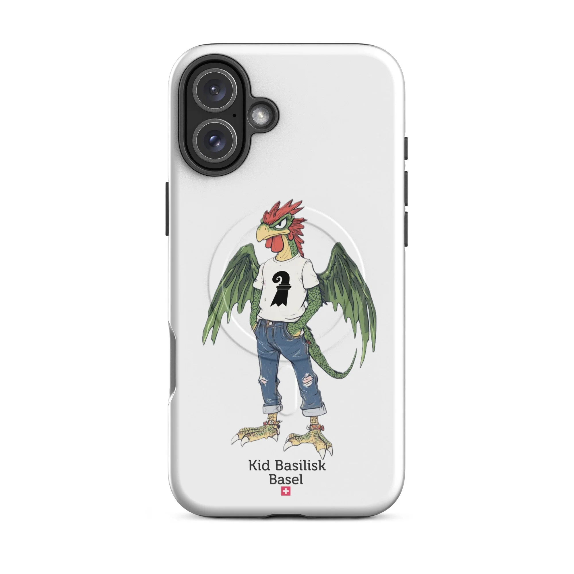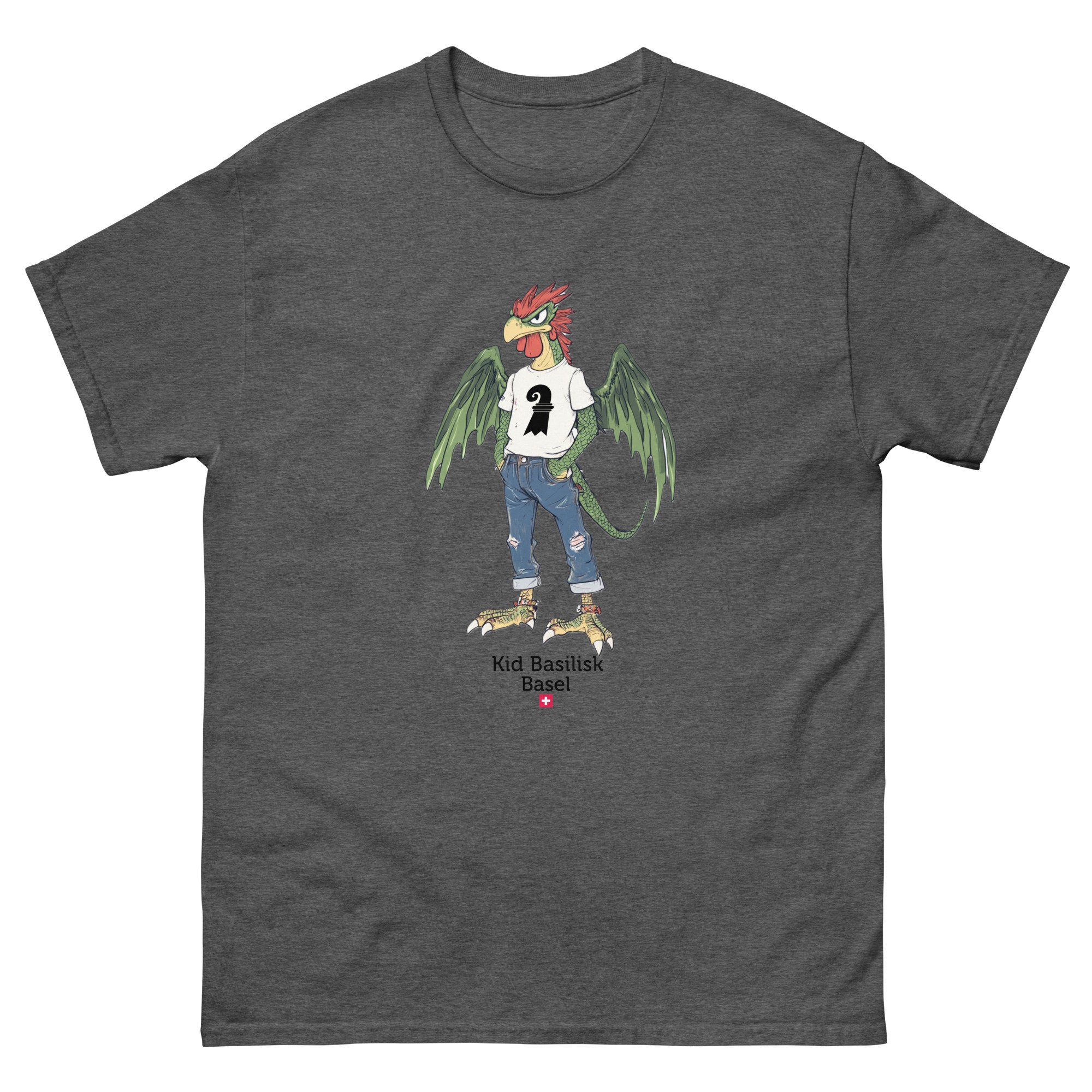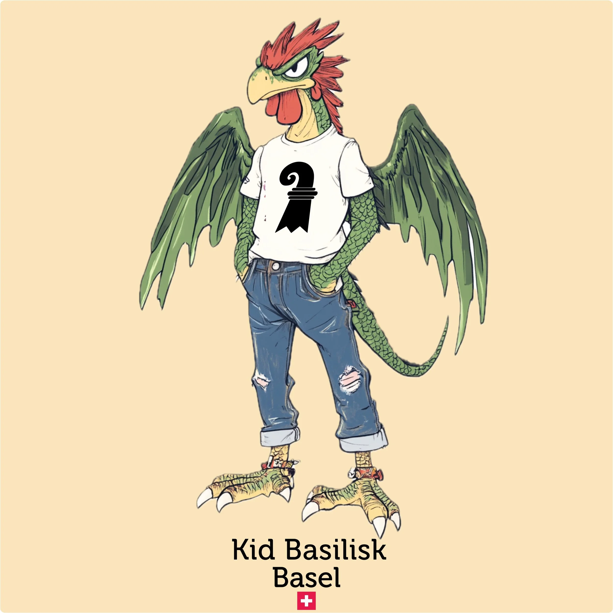 Meet Kid Basilisk — Basel's legendary heraldic dragon-rooster reimagined as a confident, streetwise teenager. Green-scaled wings spread wide, red crest sharp as ever, ripped jeans, a white tee with the Basel staff symbol, red ankle bracelets, and an expression that says he's been guarding this city for centuries and he's perfectly happy about it.