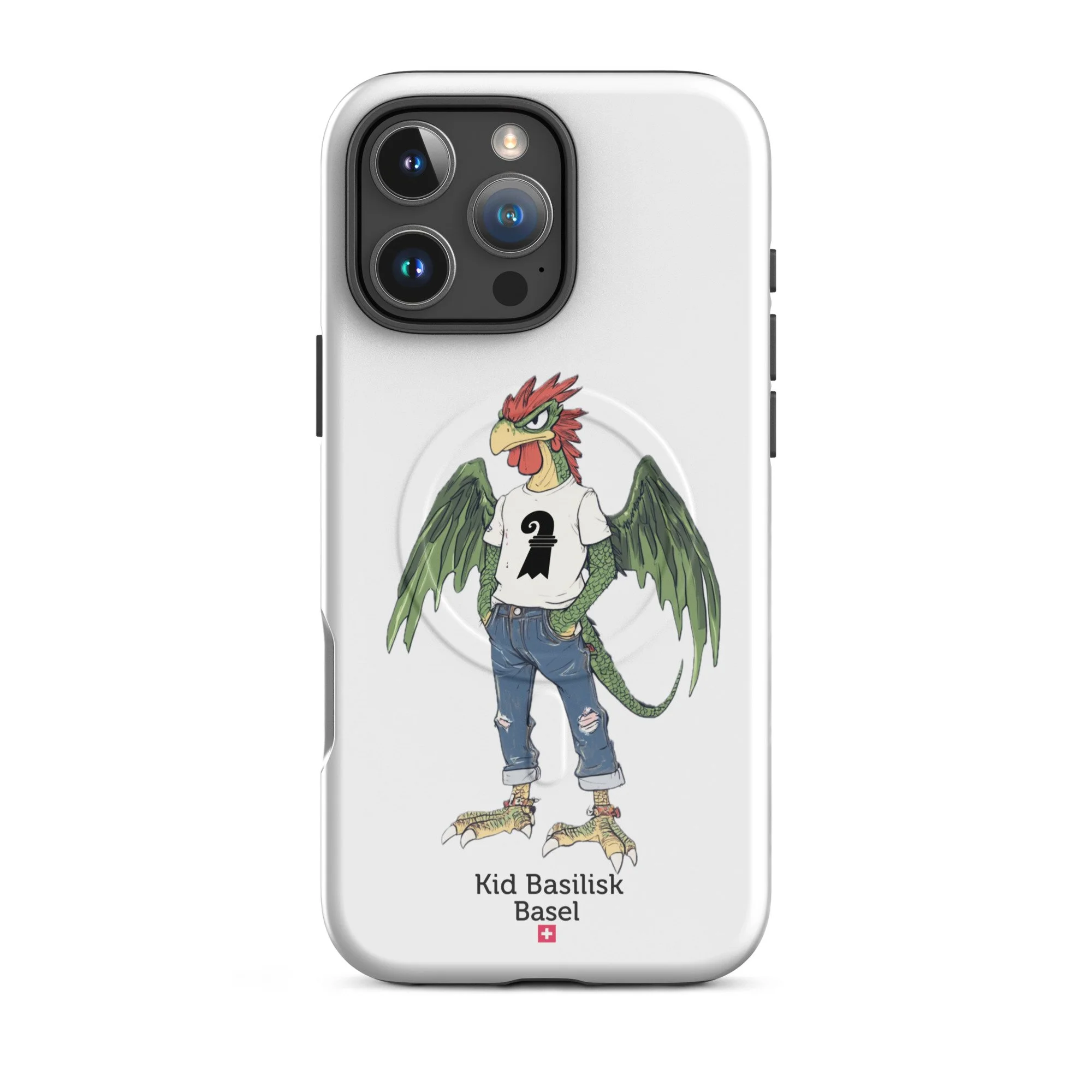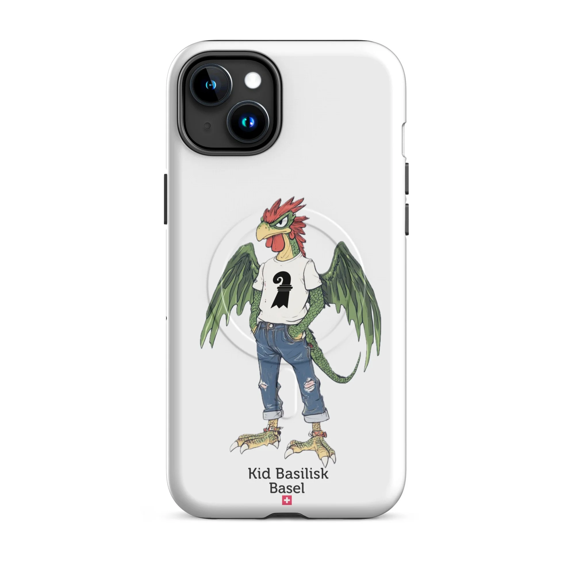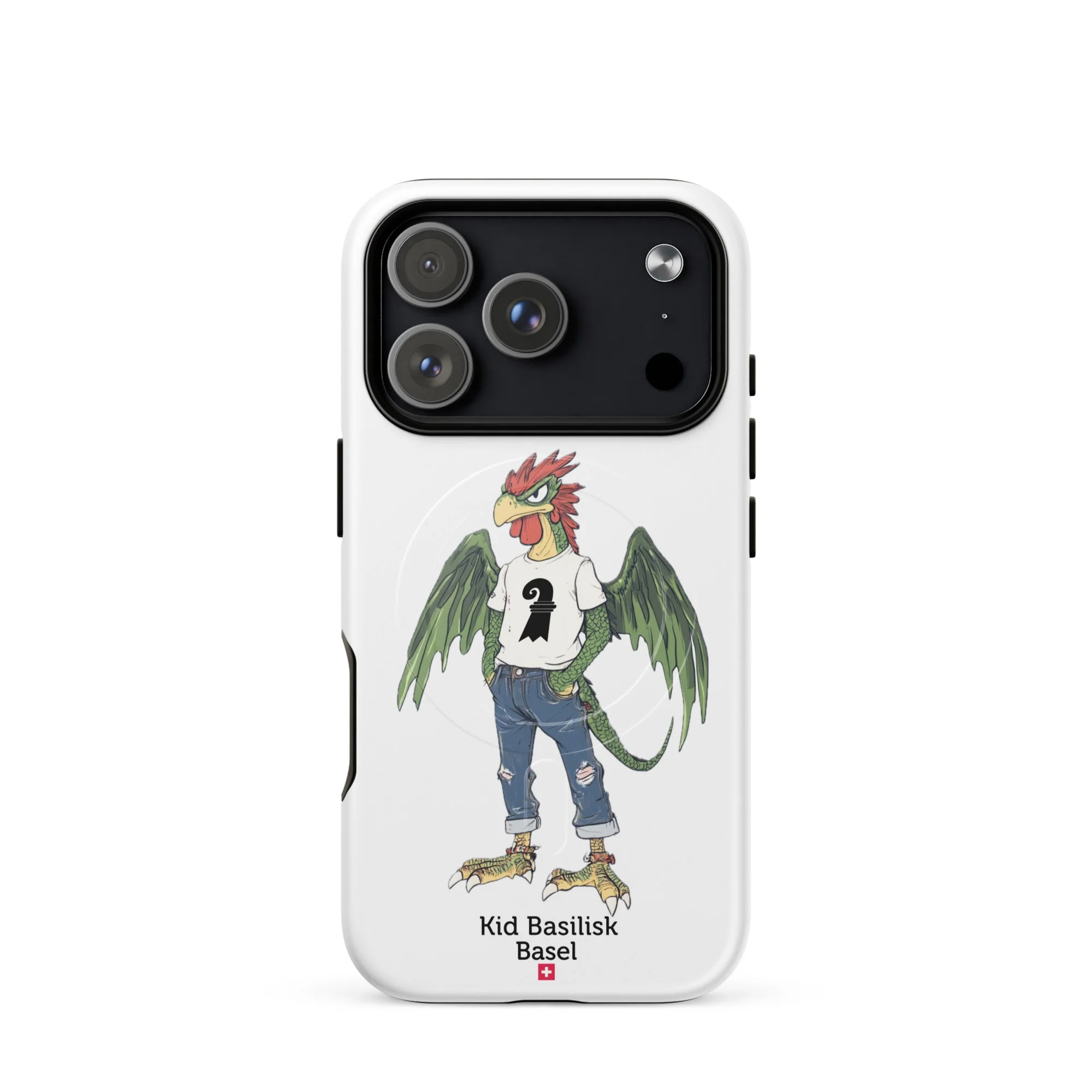 Meet Kid Basilisk — Basel's legendary heraldic dragon-rooster reimagined as a confident, streetwise teenager. Green-scaled wings spread wide, red crest sharp as ever, ripped jeans, a white tee with the Basel staff symbol, red ankle bracelets, and an expression that says he's been guarding this city for centuries and he's perfectly happy about it.