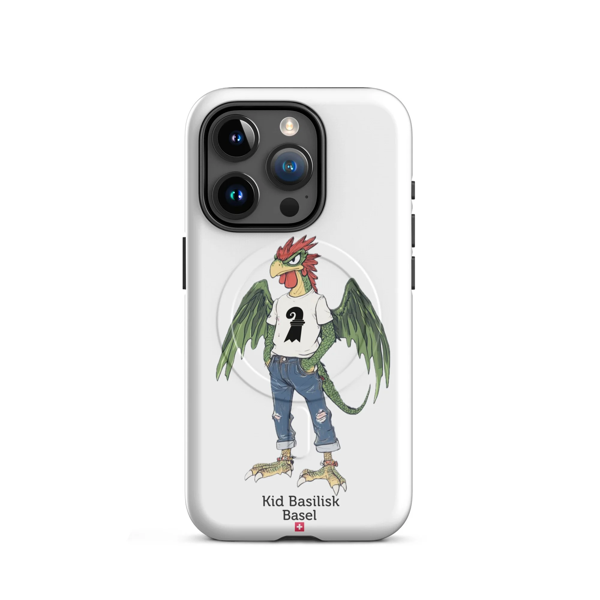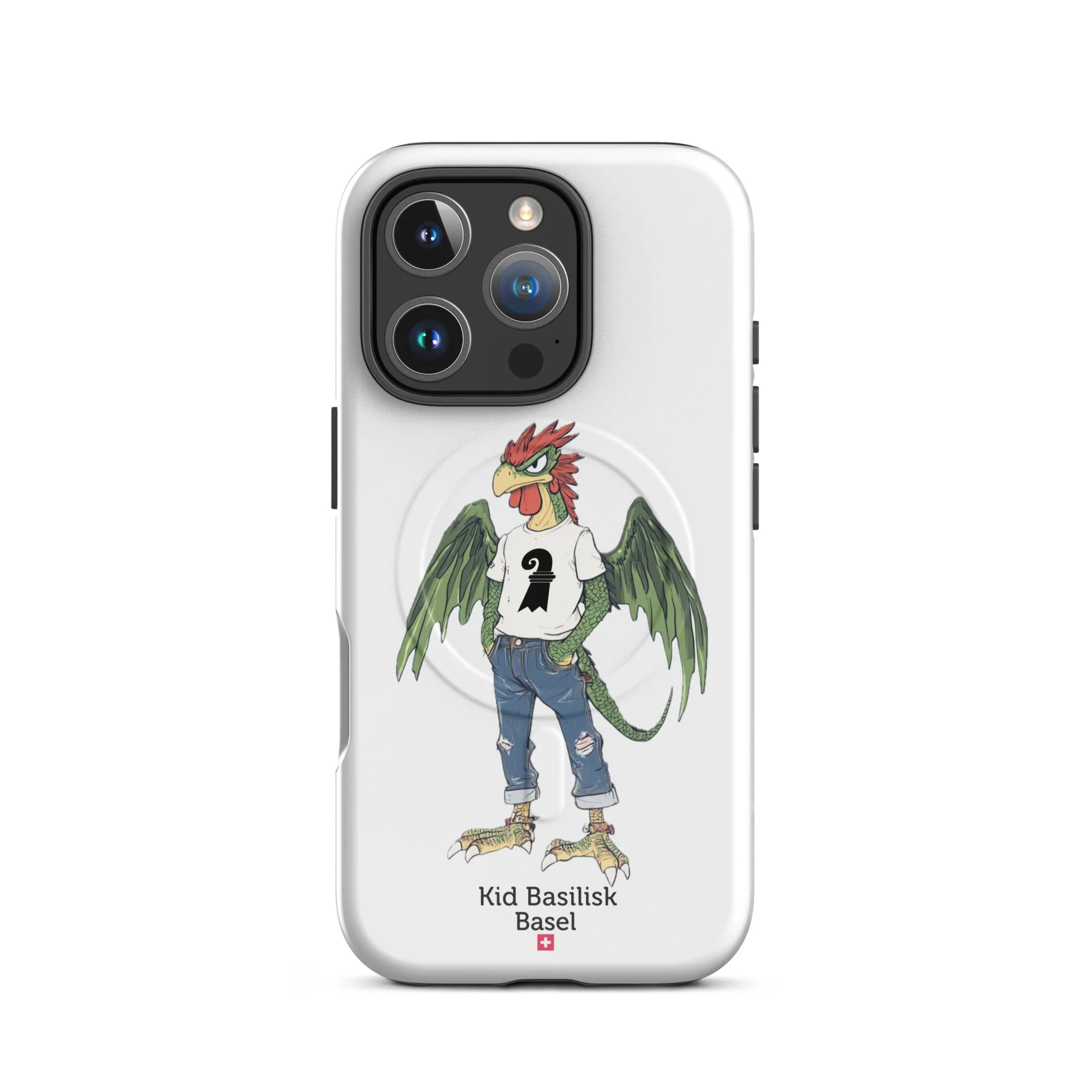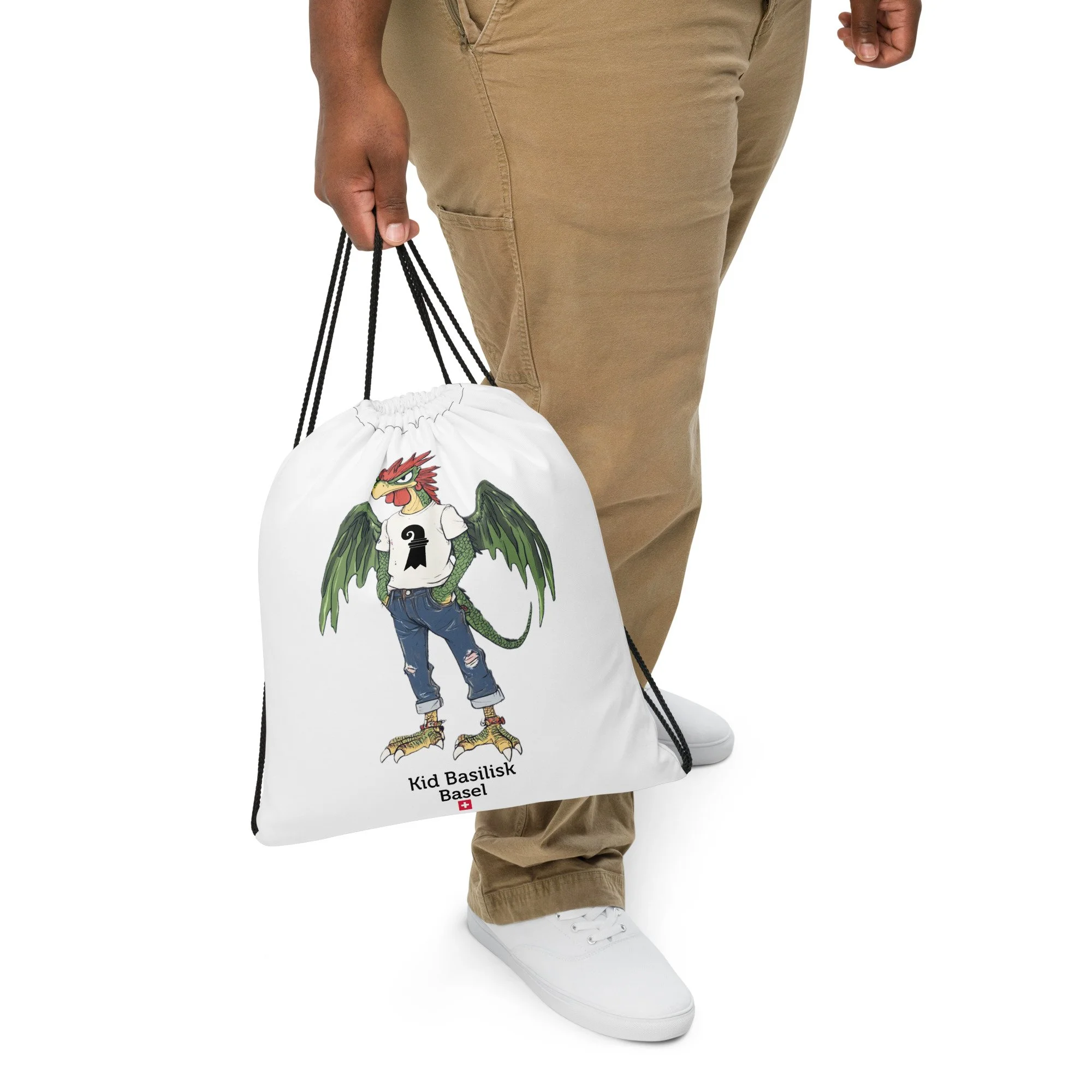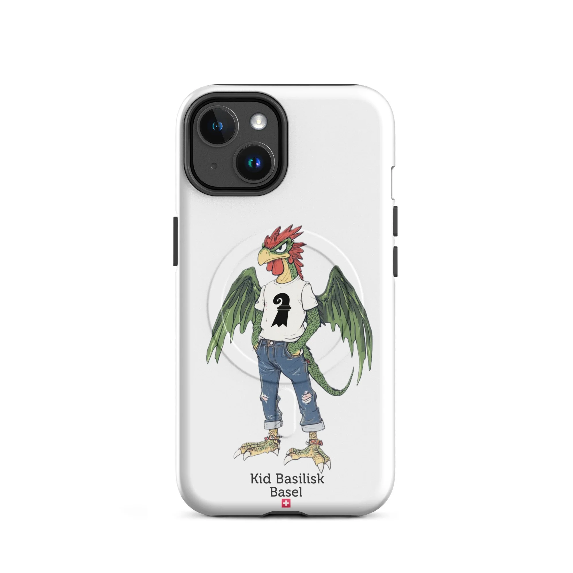 Meet Kid Basilisk — Basel's legendary heraldic dragon-rooster reimagined as a confident, streetwise teenager. Green-scaled wings spread wide, red crest sharp as ever, ripped jeans, a white tee with the Basel staff symbol, red ankle bracelets, and an expression that says he's been guarding this city for centuries and he's perfectly happy about it.