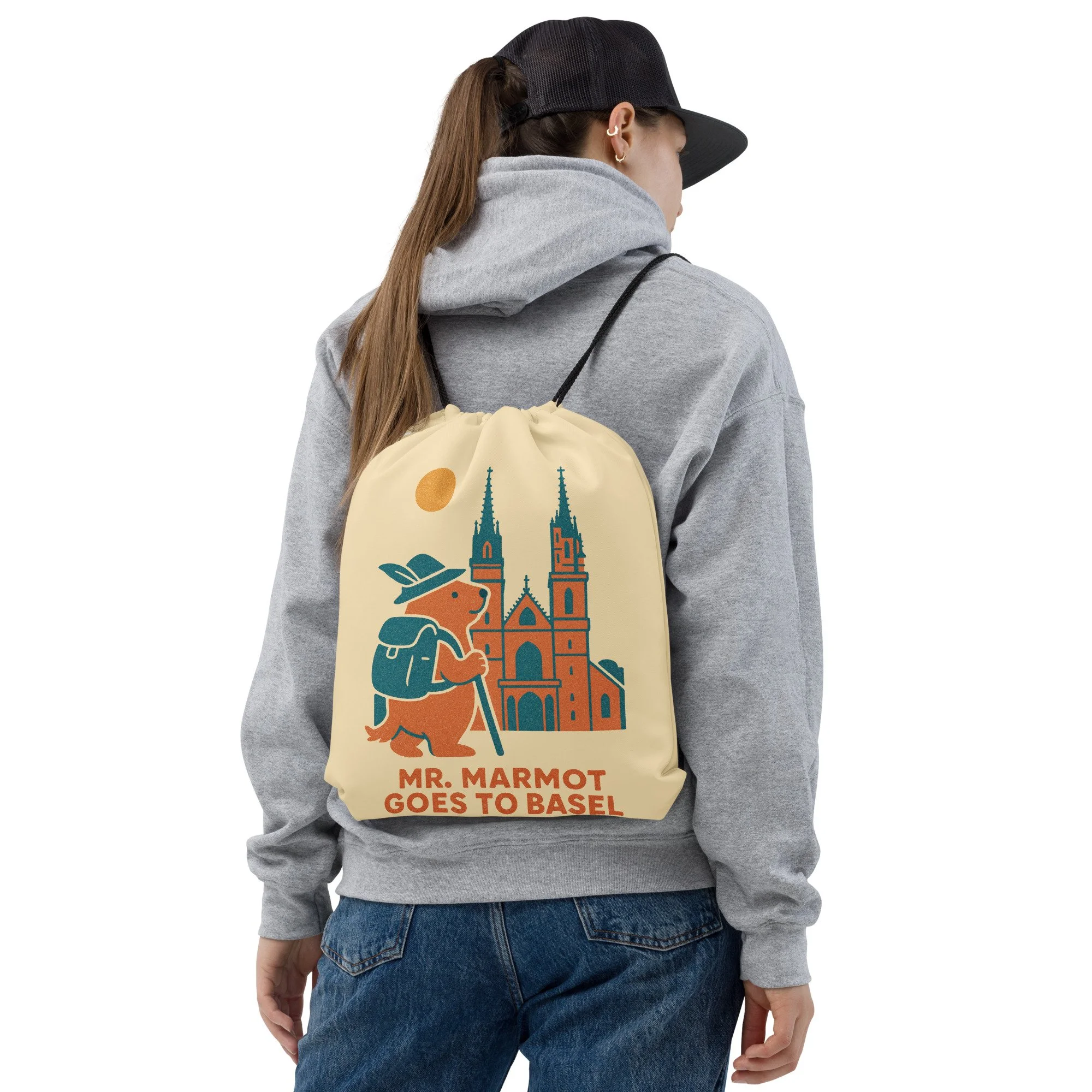 The Basel Münster rises behind Mr. Marmot as he stands, walking stick in hand, ready for whatever Basel has in store. This portrait-format design — with the cathedral's twin spires reaching upward and Mr. Marmot's confident presence in the foreground — makes for a drawstring backpack with real visual impact.