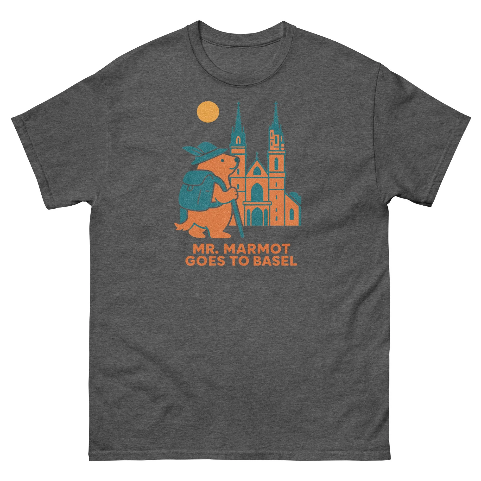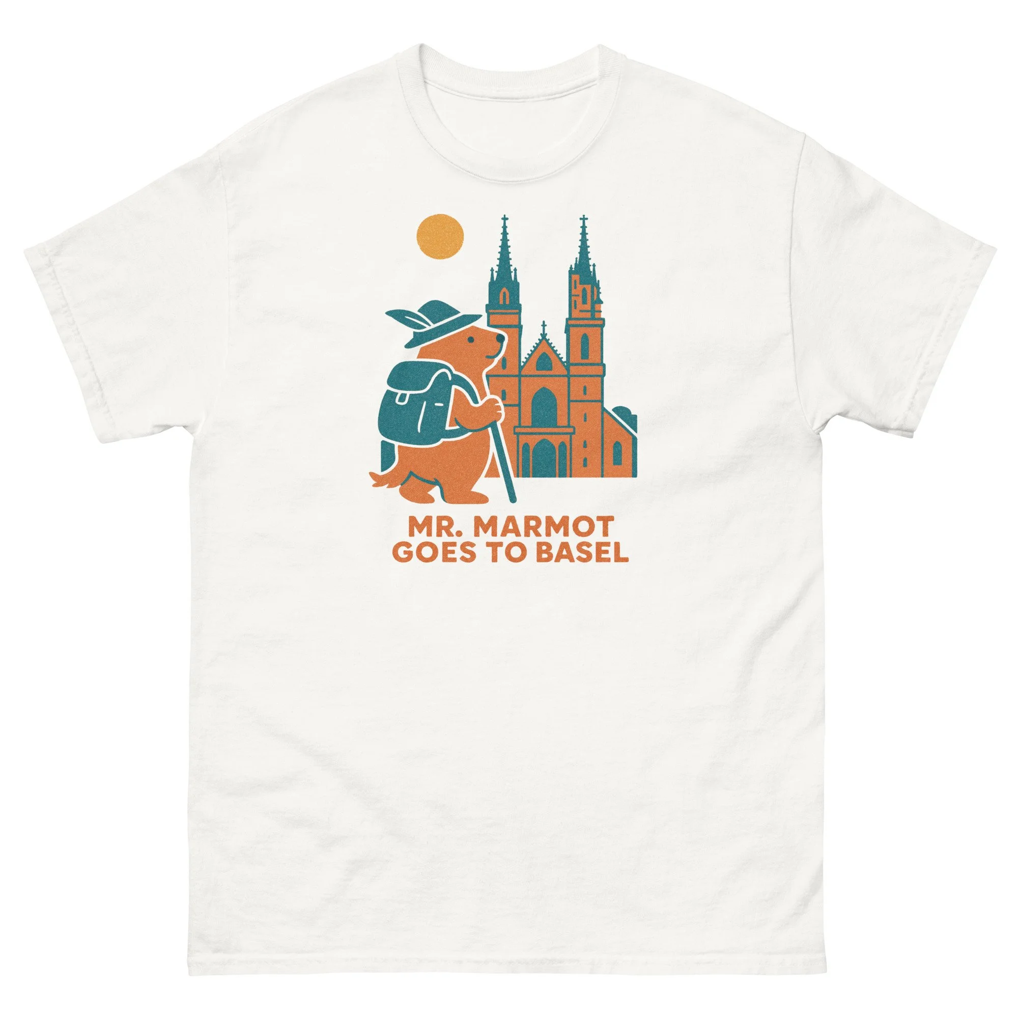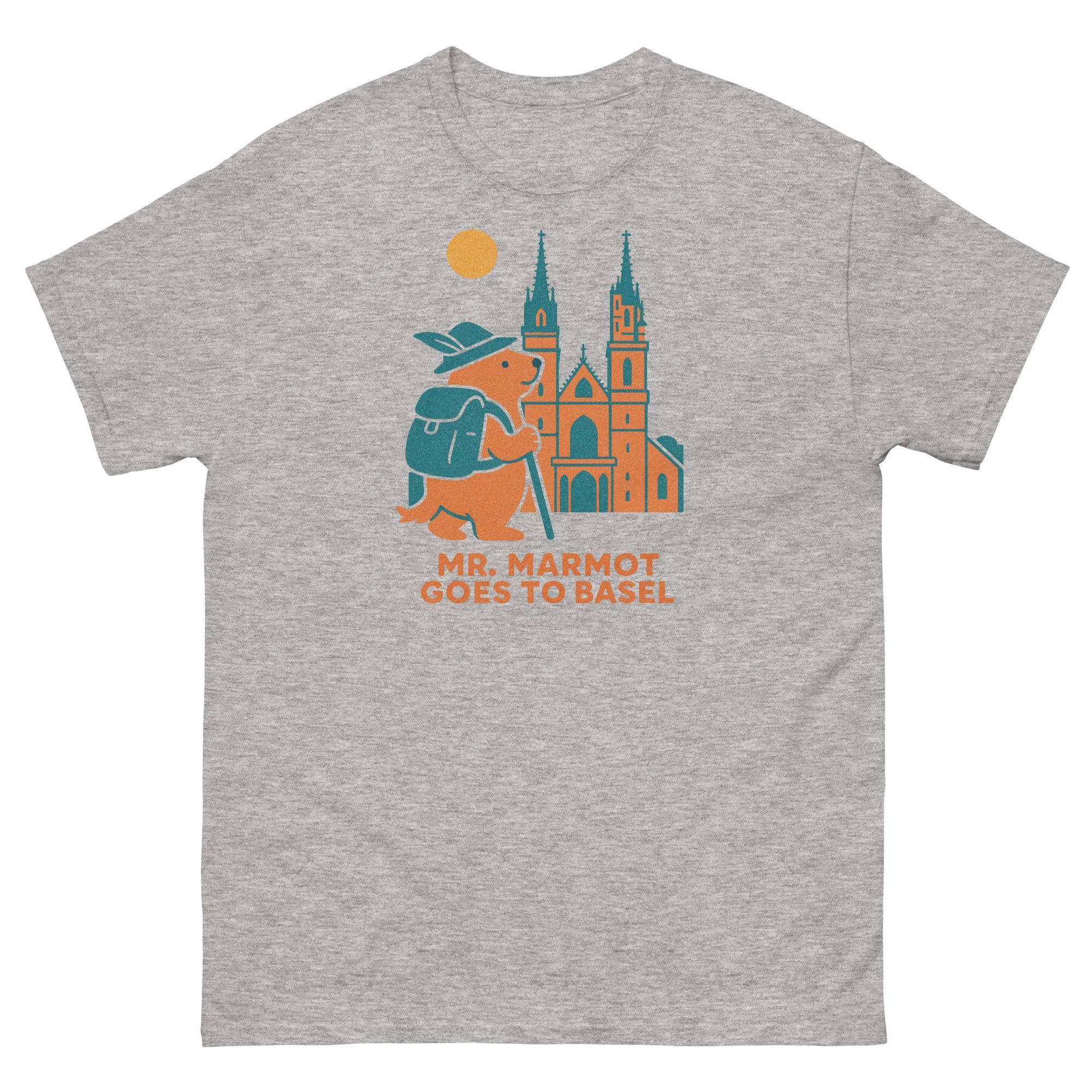 Mr. Marmot has found himself face to face with Basel's greatest building — the Münster — and he's not in the least bit intimidated. Hat on, walking stick in hand, teal backpack in place, he stands before the cathedral's twin spires and elaborate Gothic portal with the easy confidence of someone who has earned this view.