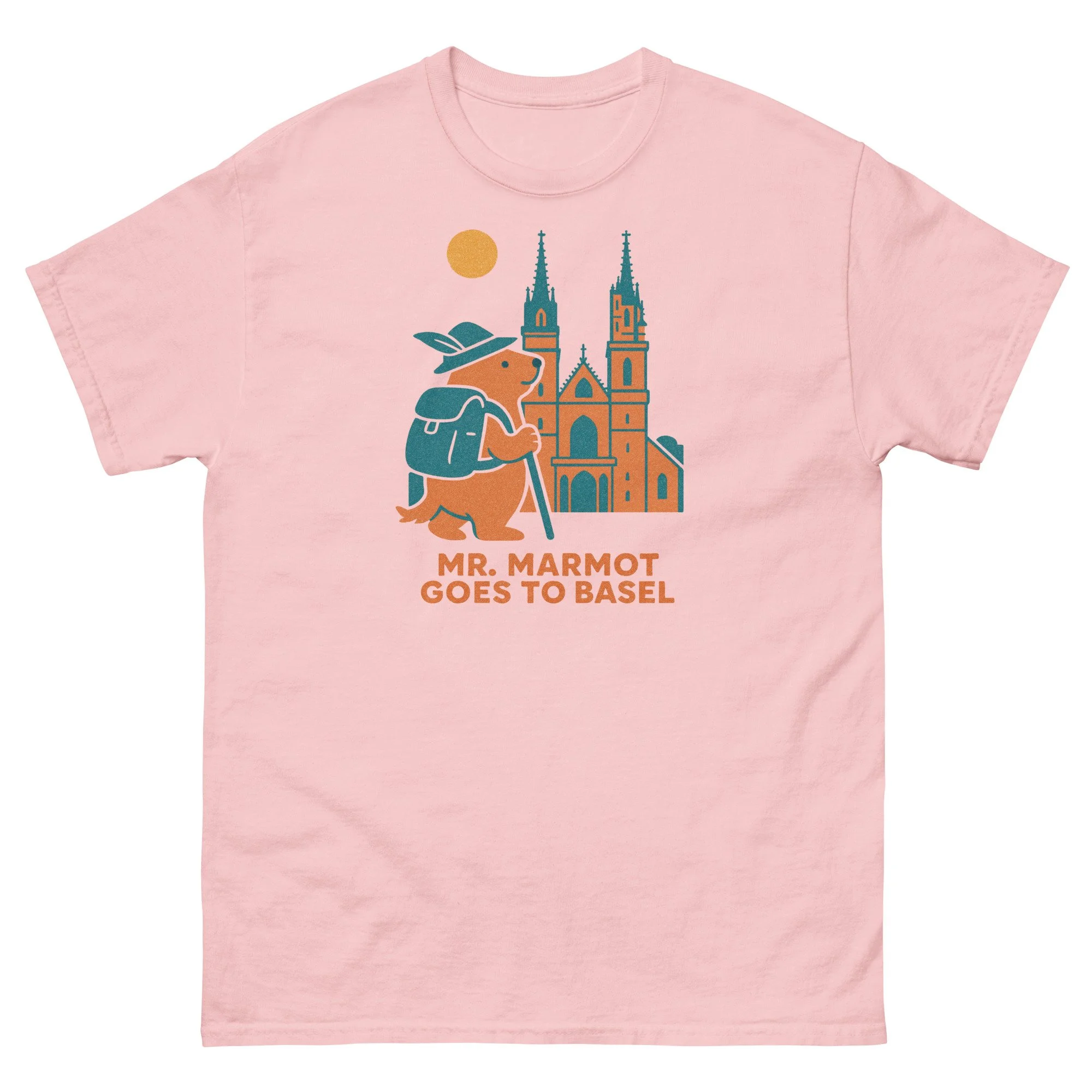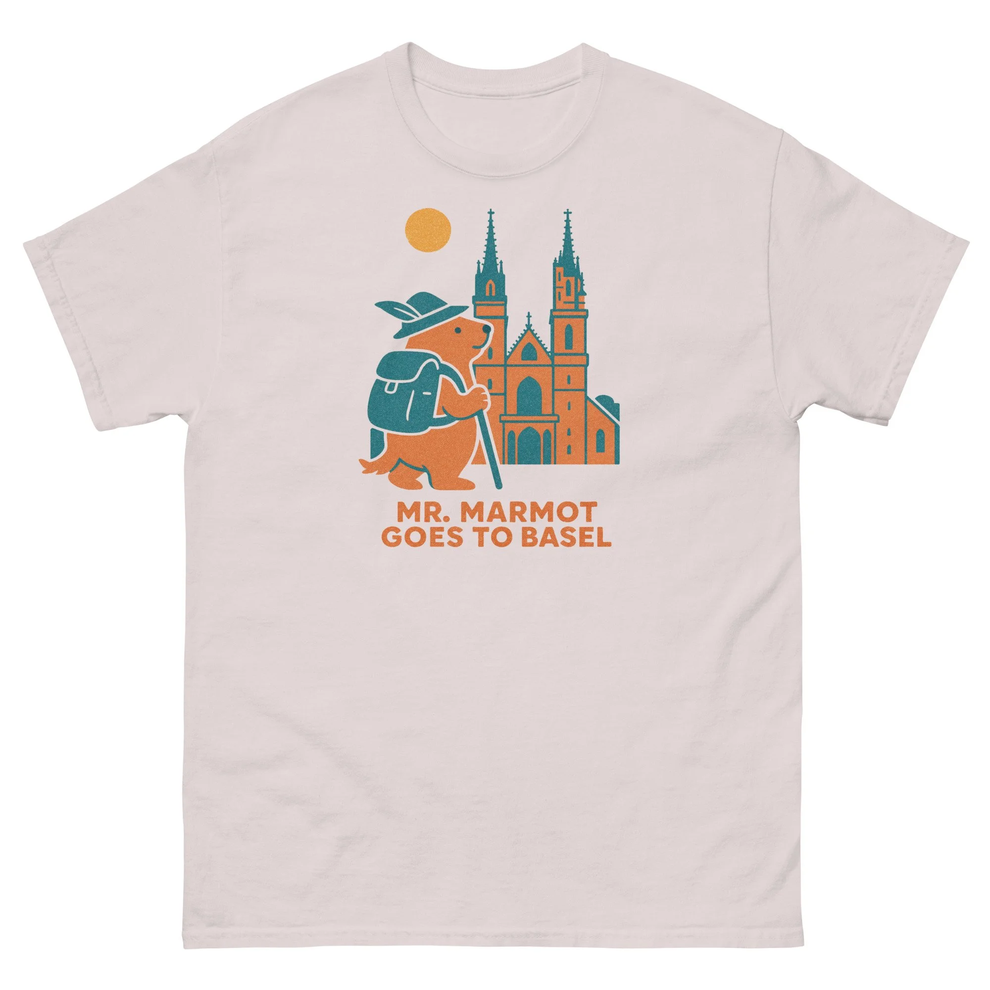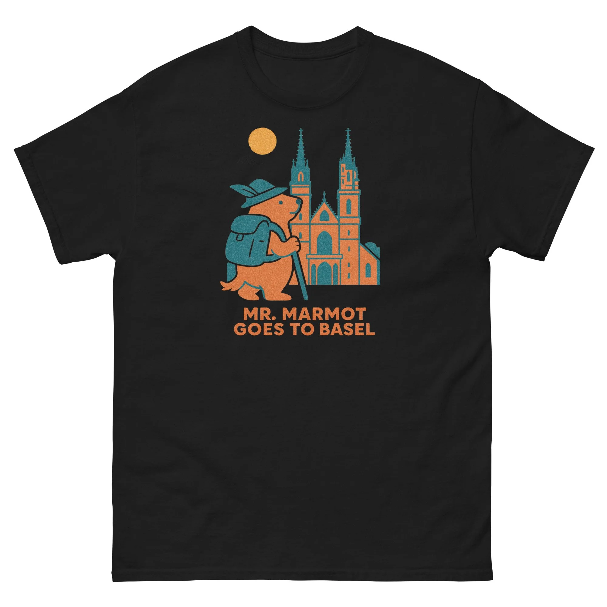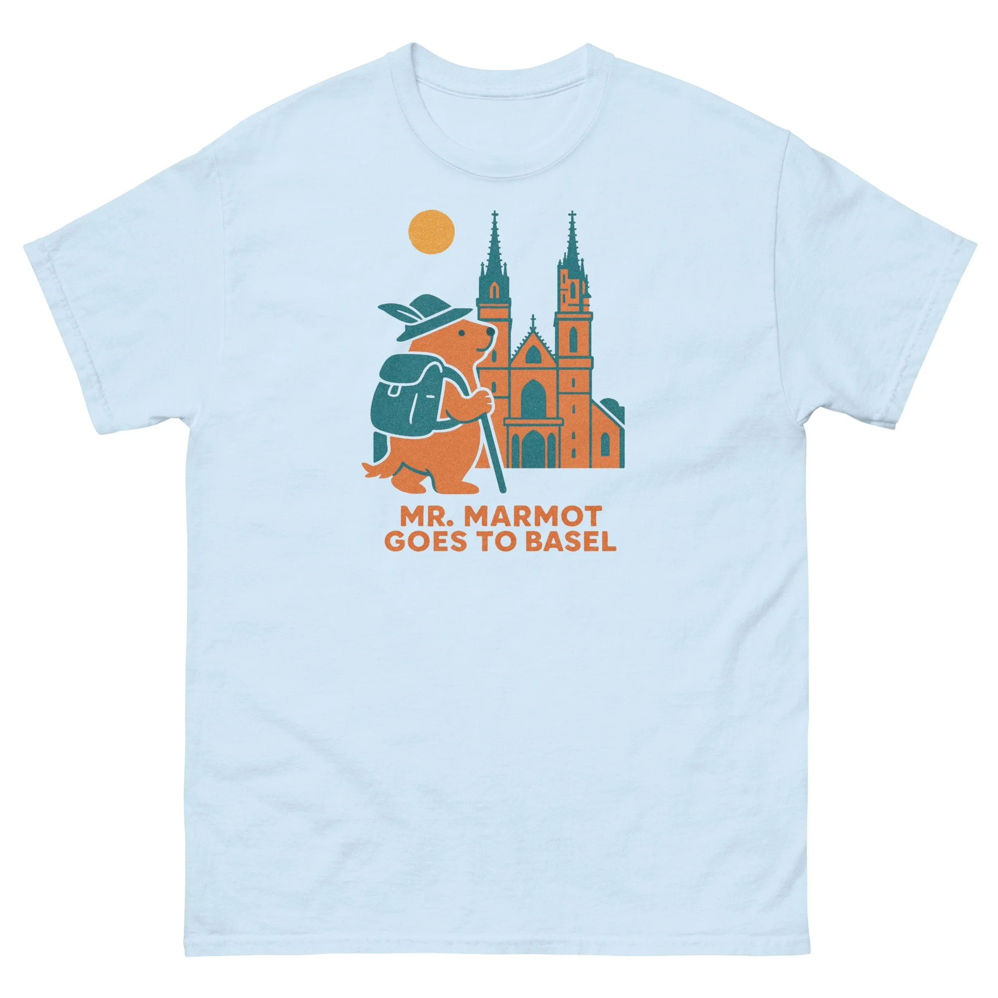 Mr. Marmot has found himself face to face with Basel's greatest building — the Münster — and he's not in the least bit intimidated. Hat on, walking stick in hand, teal backpack in place, he stands before the cathedral's twin spires and elaborate Gothic portal with the easy confidence of someone who has earned this view.
