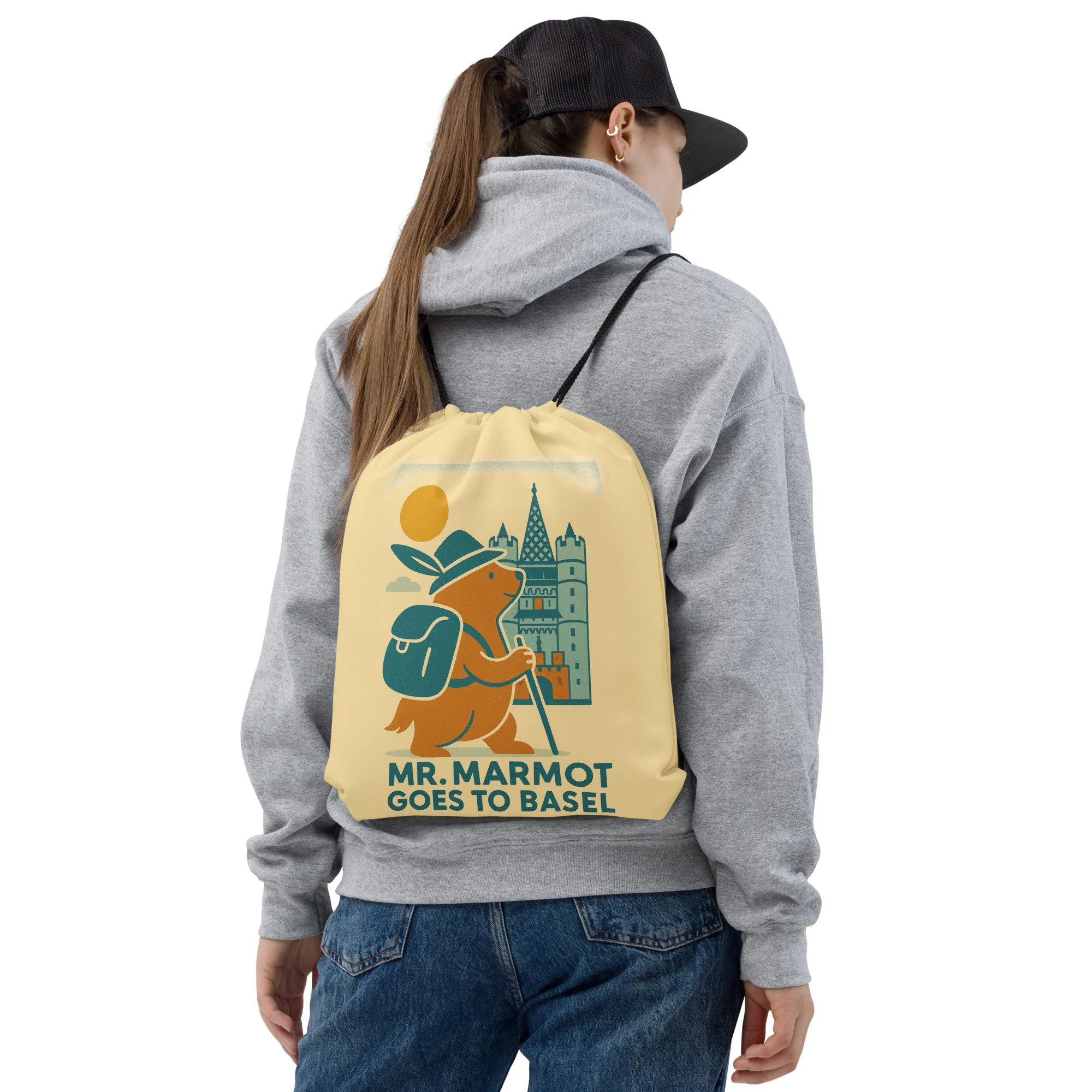 Mr. Marmot never travels without his backpack — and neither should you. This lightweight drawstring backpack features the charming retro illustration of Mr. Marmot arriving at the Spalentor with hat, walking stick and characteristic enthusiasm — making it the most cheerful bag in any gym, school, or adventure.
