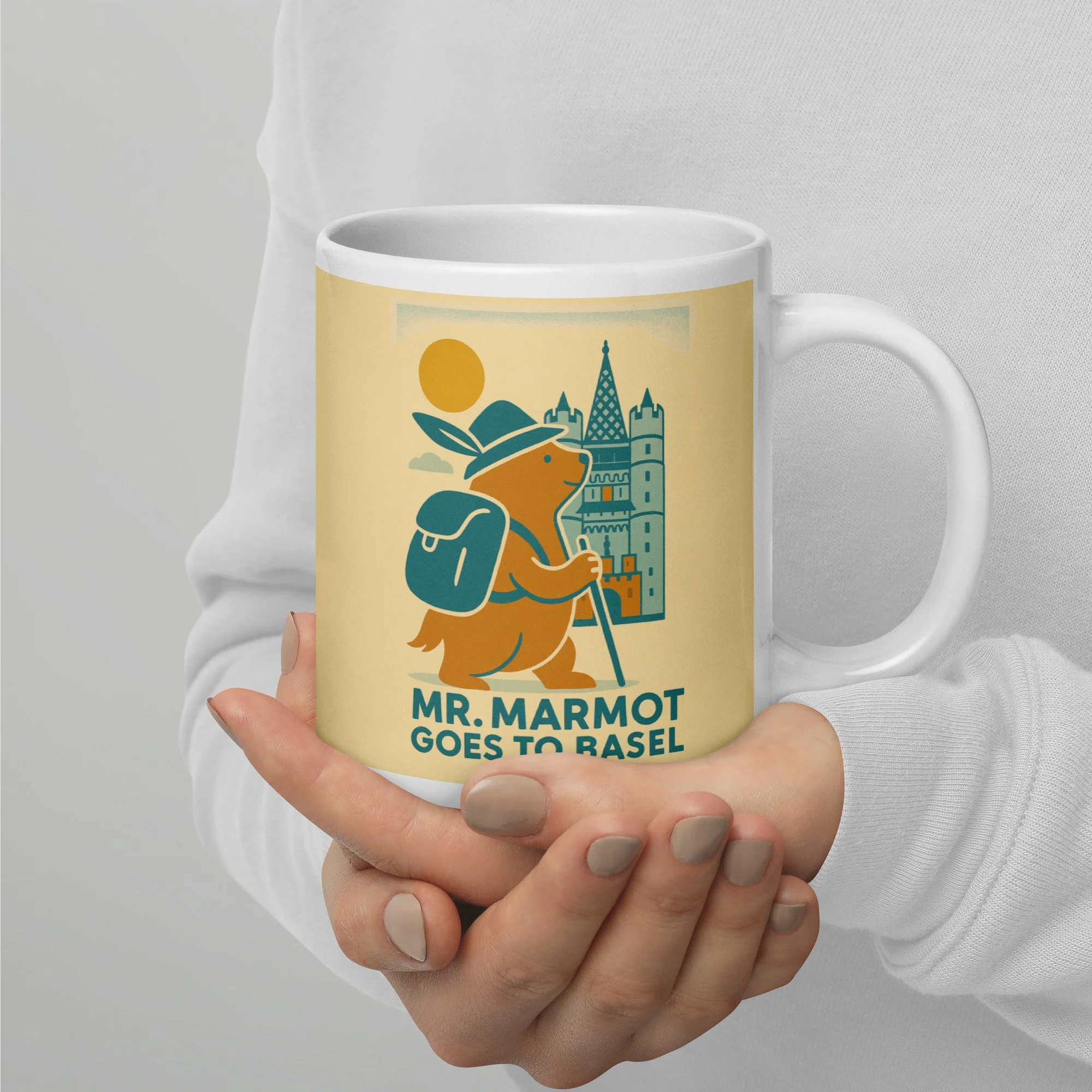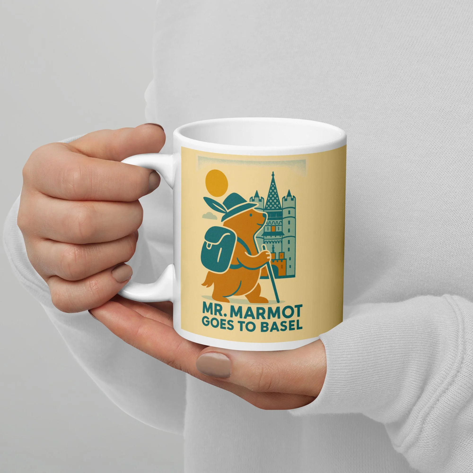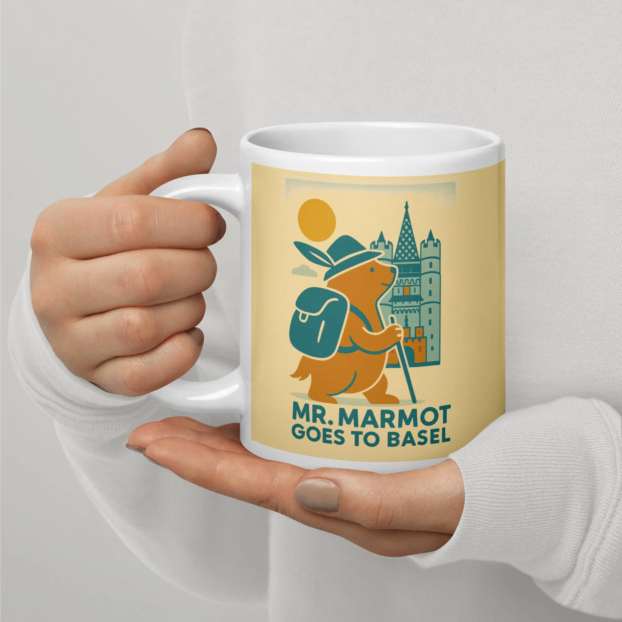 Start every morning with Mr. Marmot and the Spalentor. This ceramic mug features the charming retro illustration of Basel's most enthusiastic marmot visitor arriving at the medieval city gate — hat on, walking stick in hand, backpack packed and ready for the day.