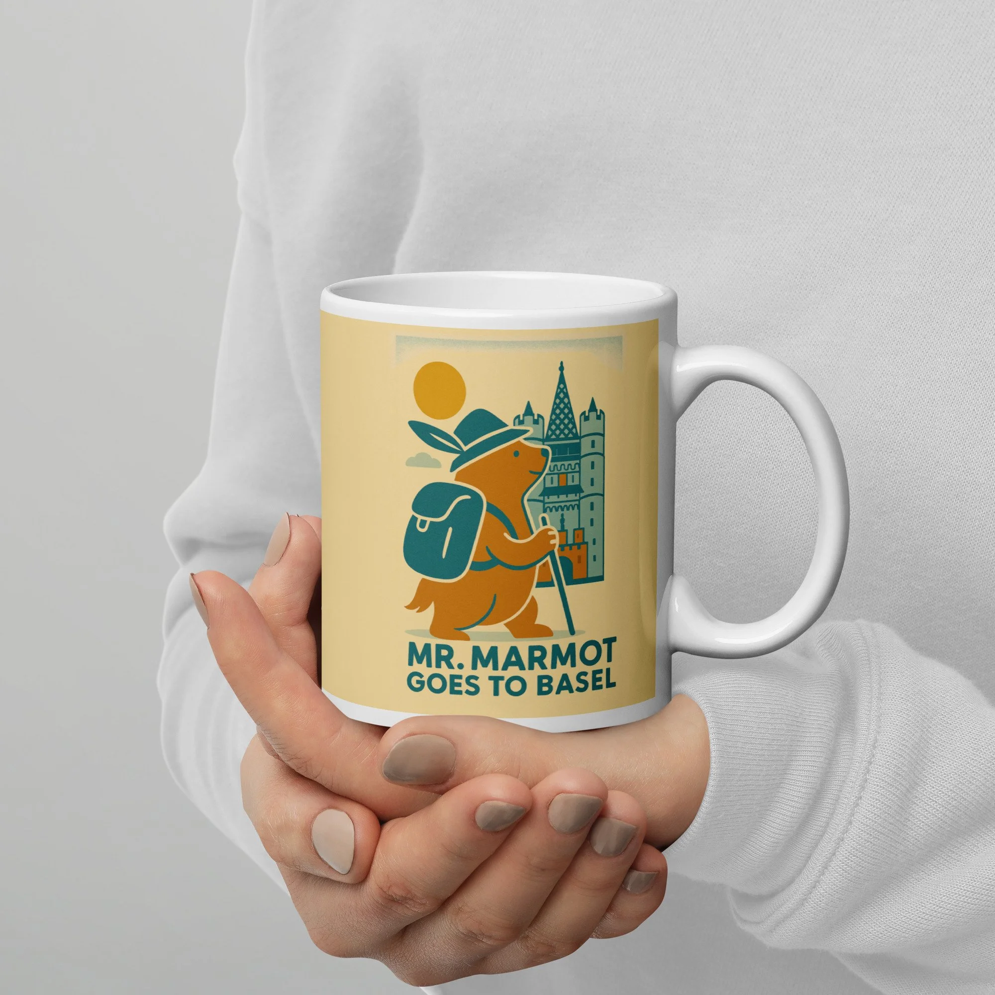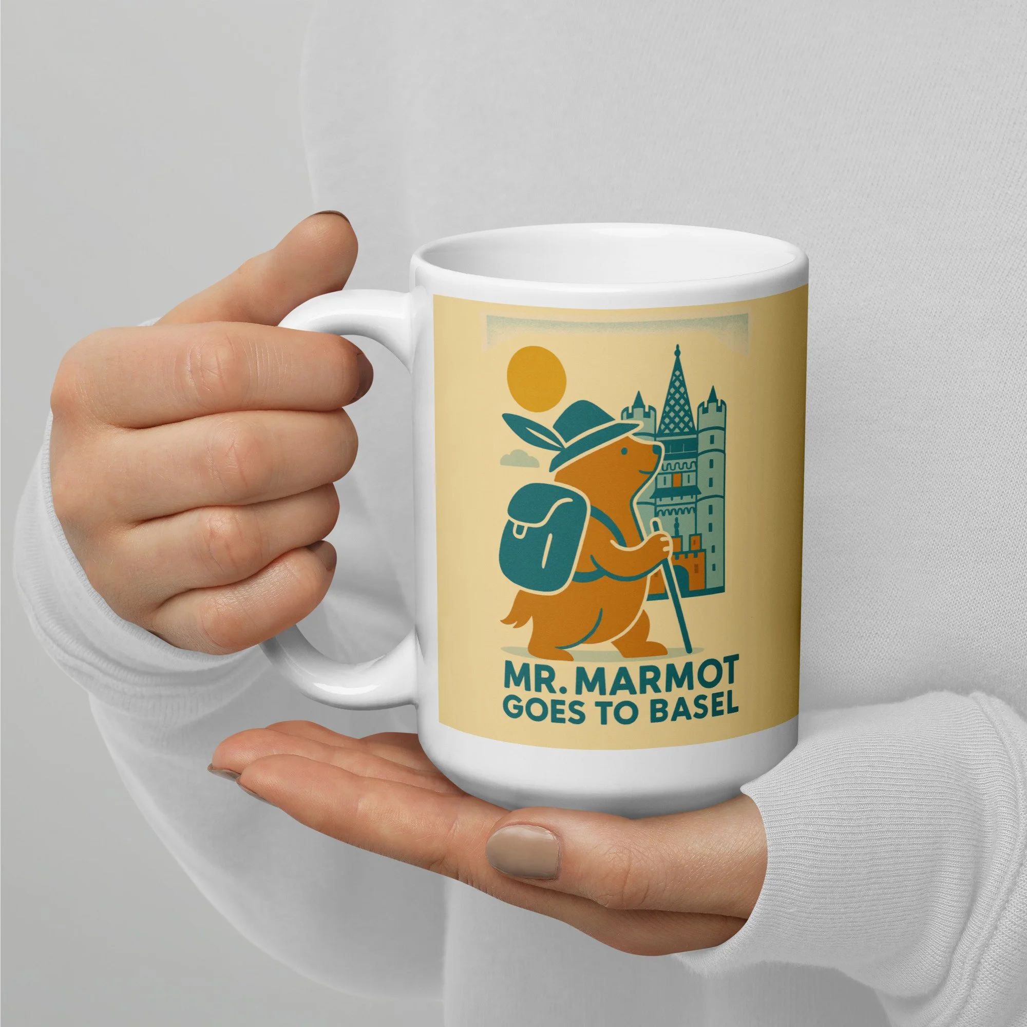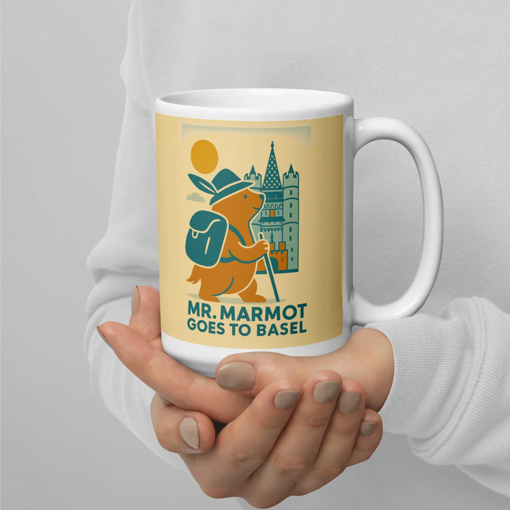 Start every morning with Mr. Marmot and the Spalentor. This ceramic mug features the charming retro illustration of Basel's most enthusiastic marmot visitor arriving at the medieval city gate — hat on, walking stick in hand, backpack packed and ready for the day.