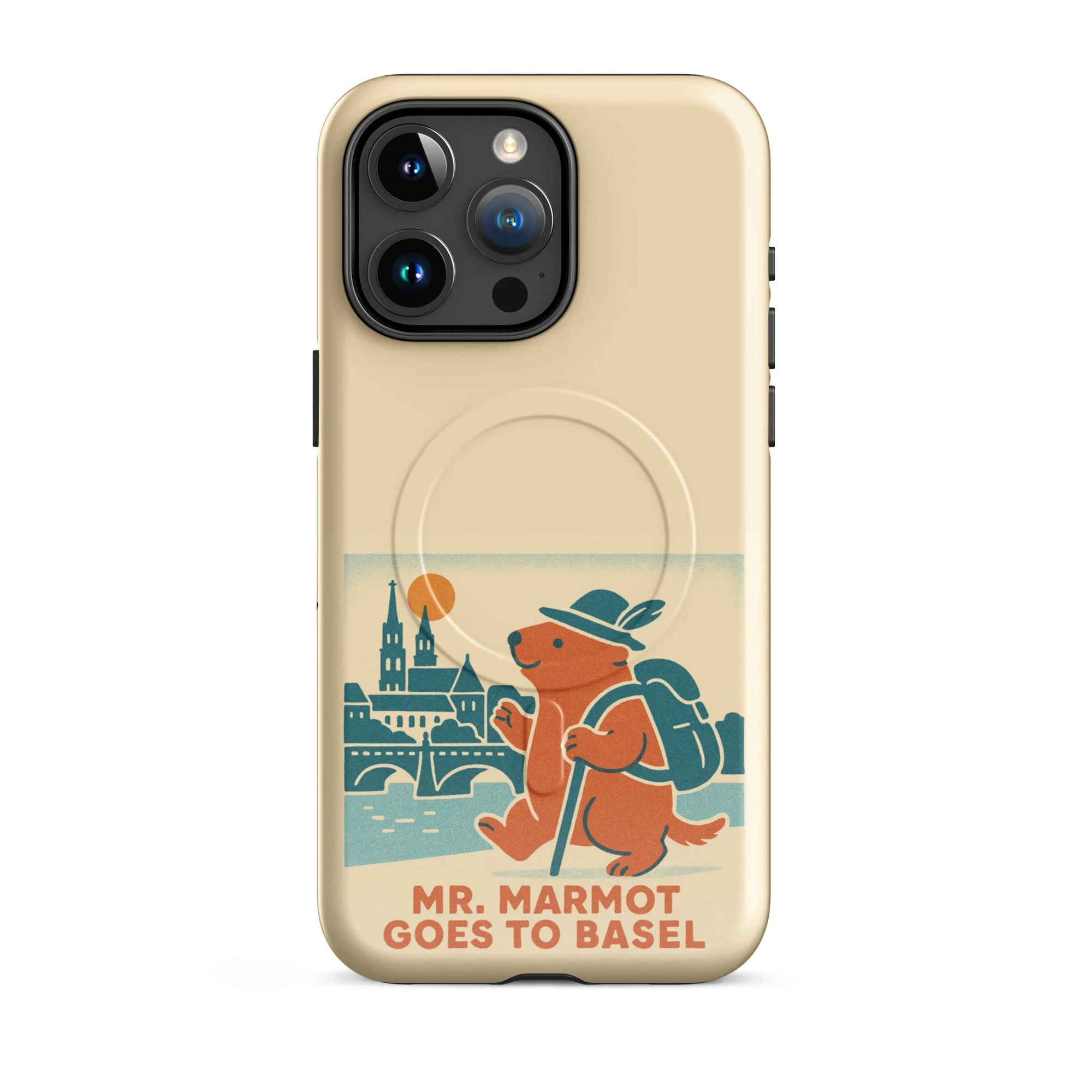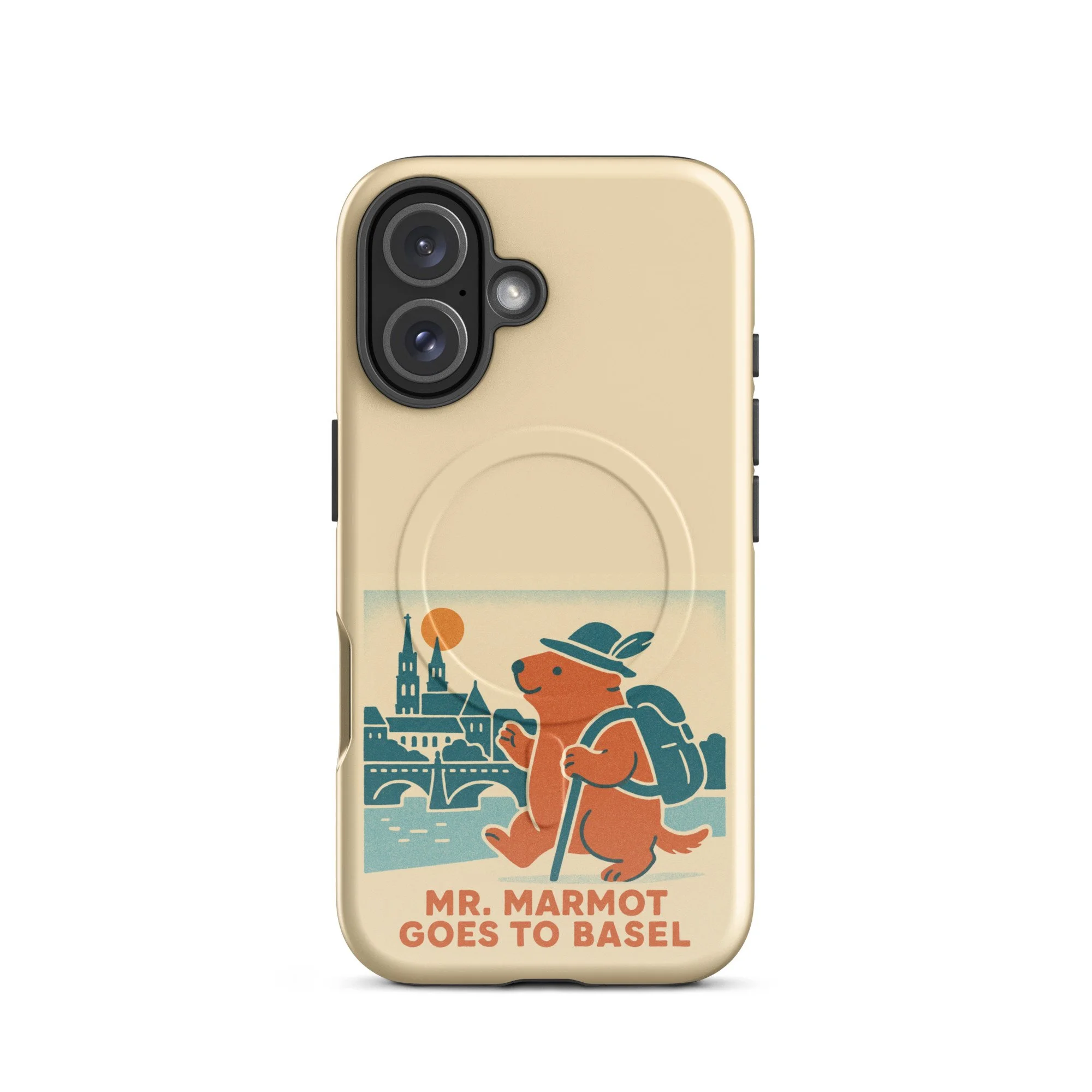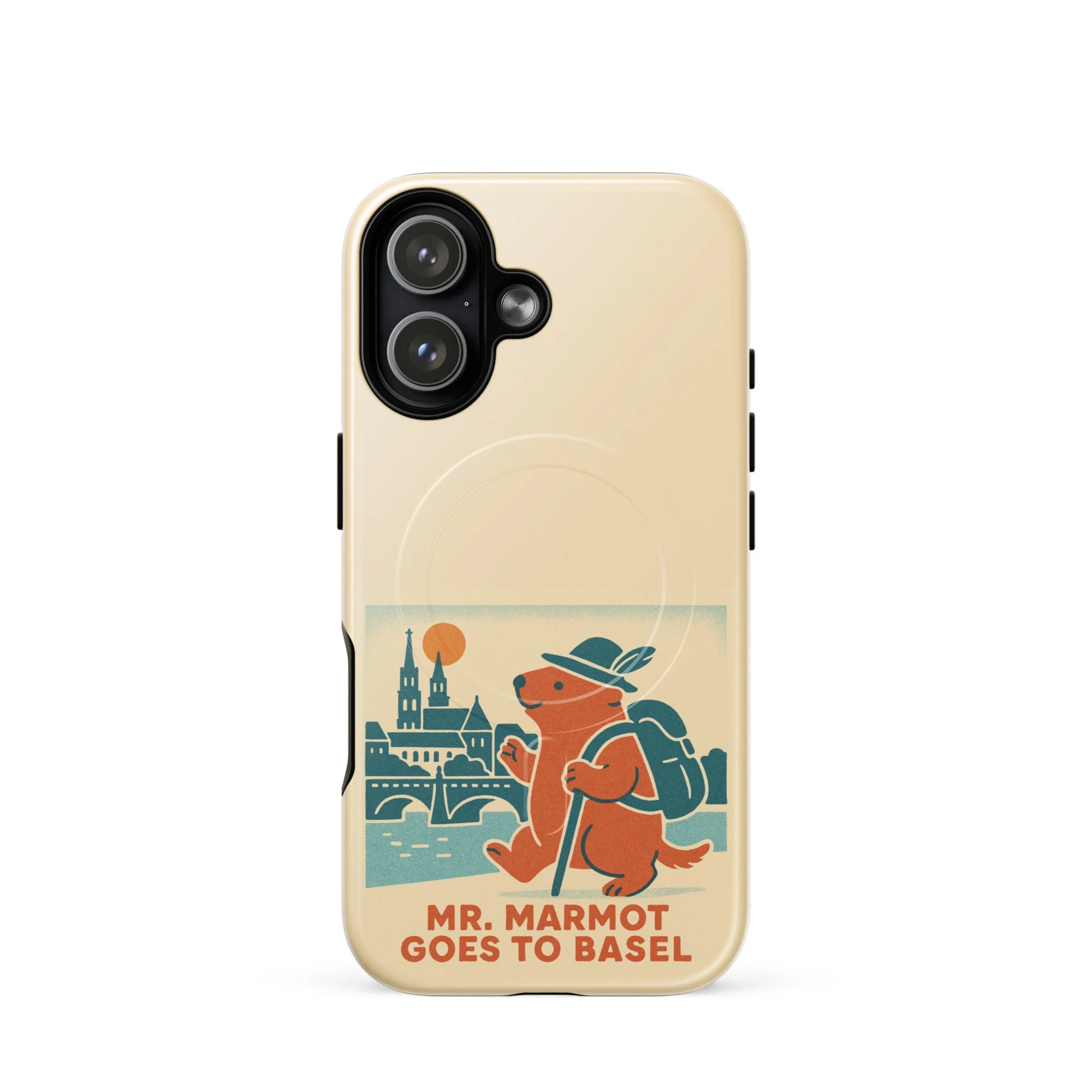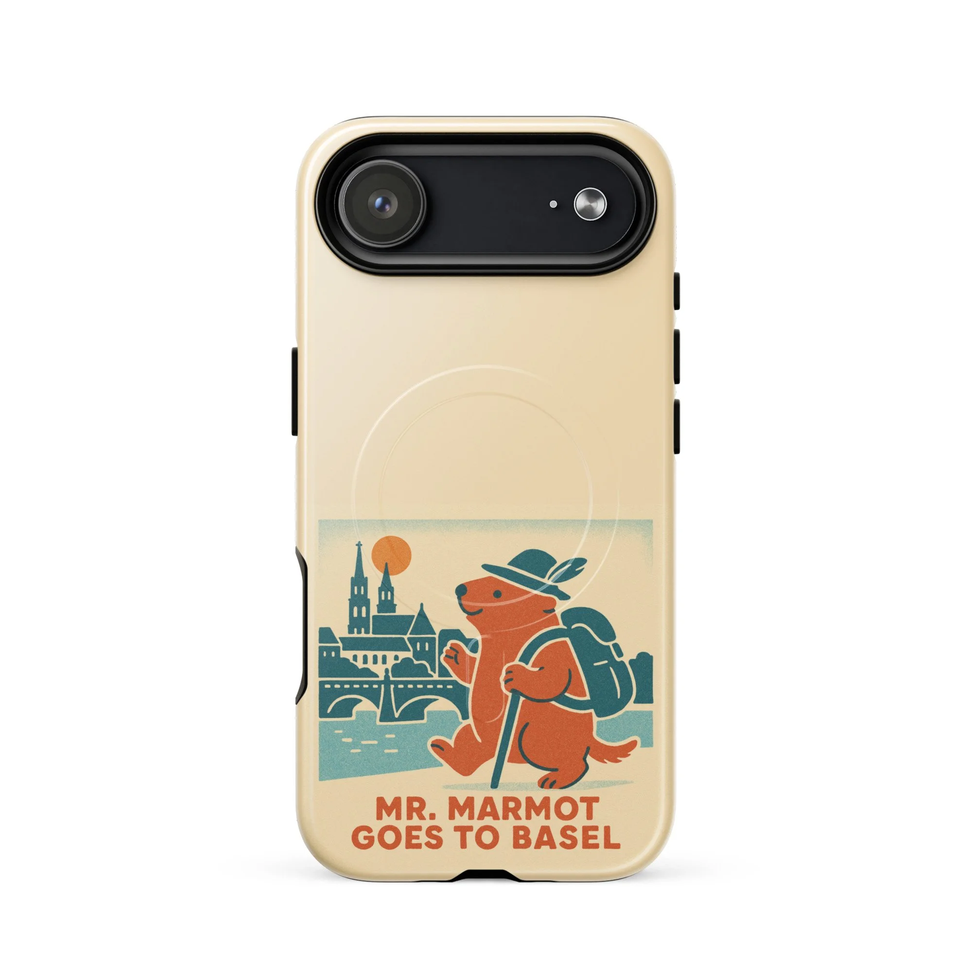 The Rhine, the Münster, and Mr. Marmot — on your iPhone. This MagSafe-compatible case features the charming retro illustration of Mr. Marmot striding along the riverbank with the cathedral and Rhine bridge behind him, in the warm cream, teal and burnt orange palette of the series.