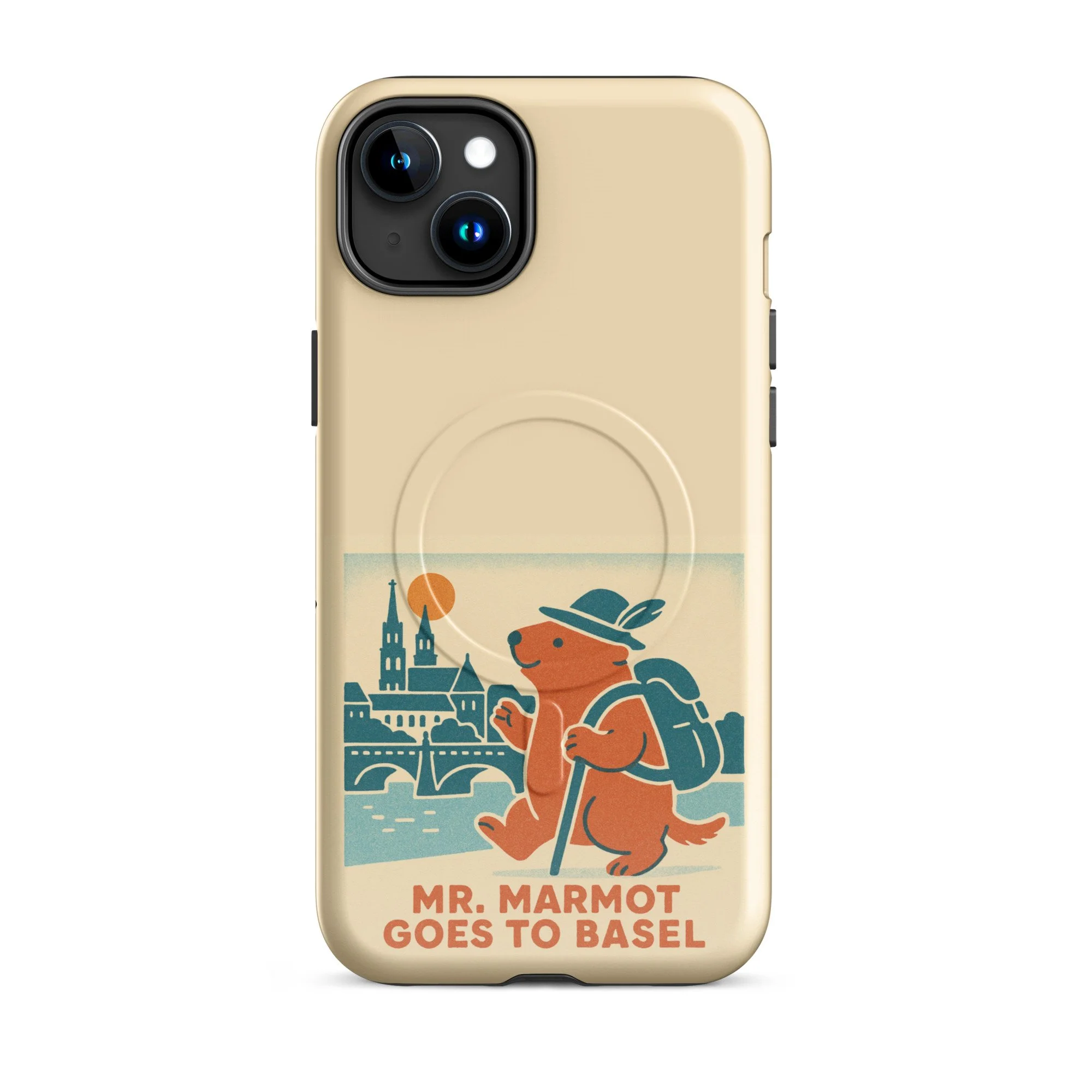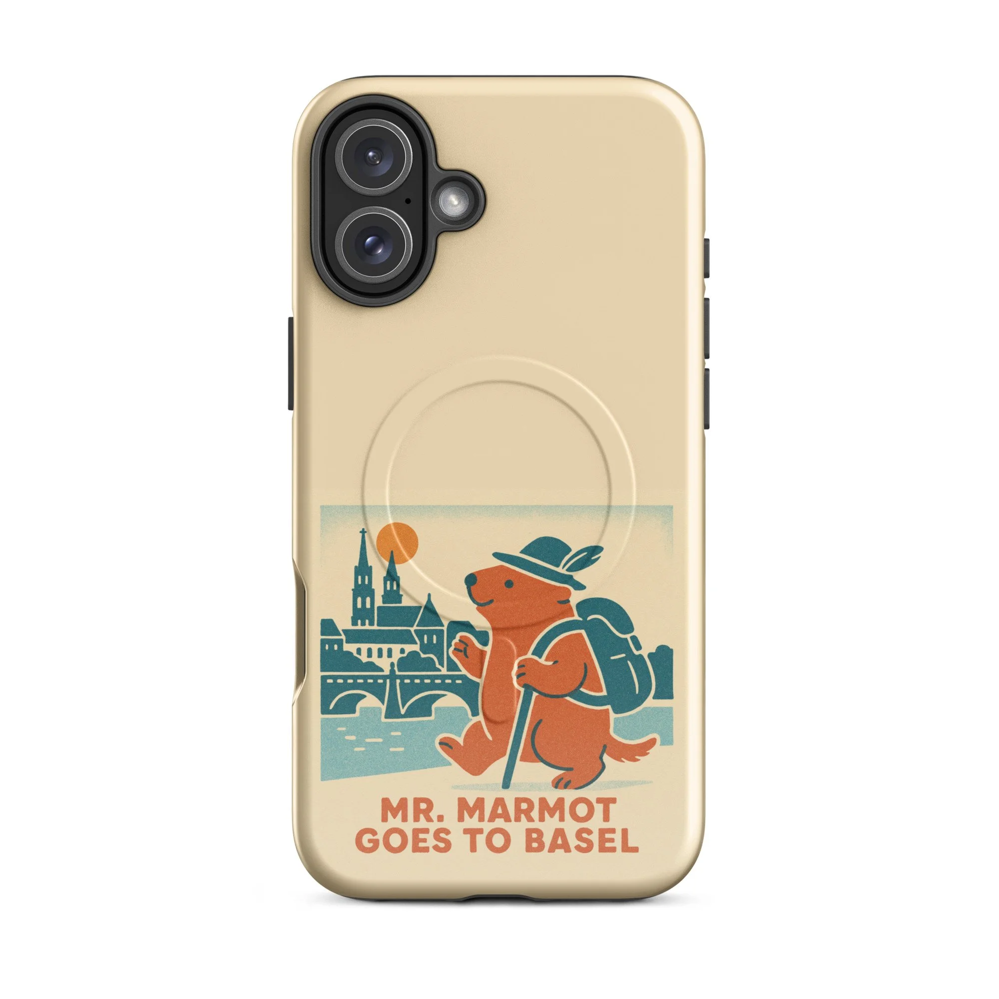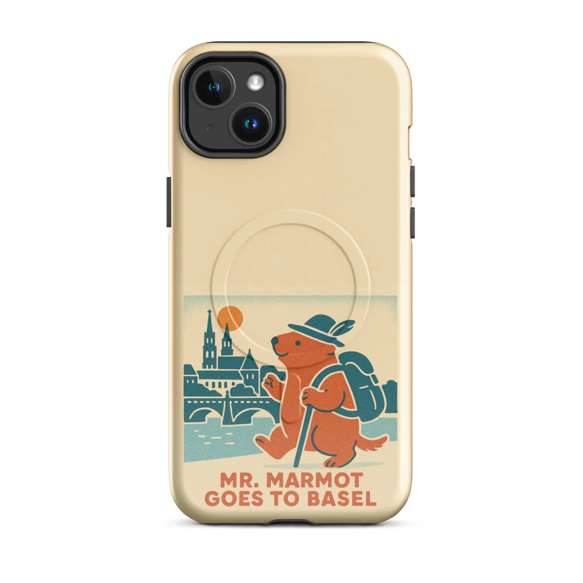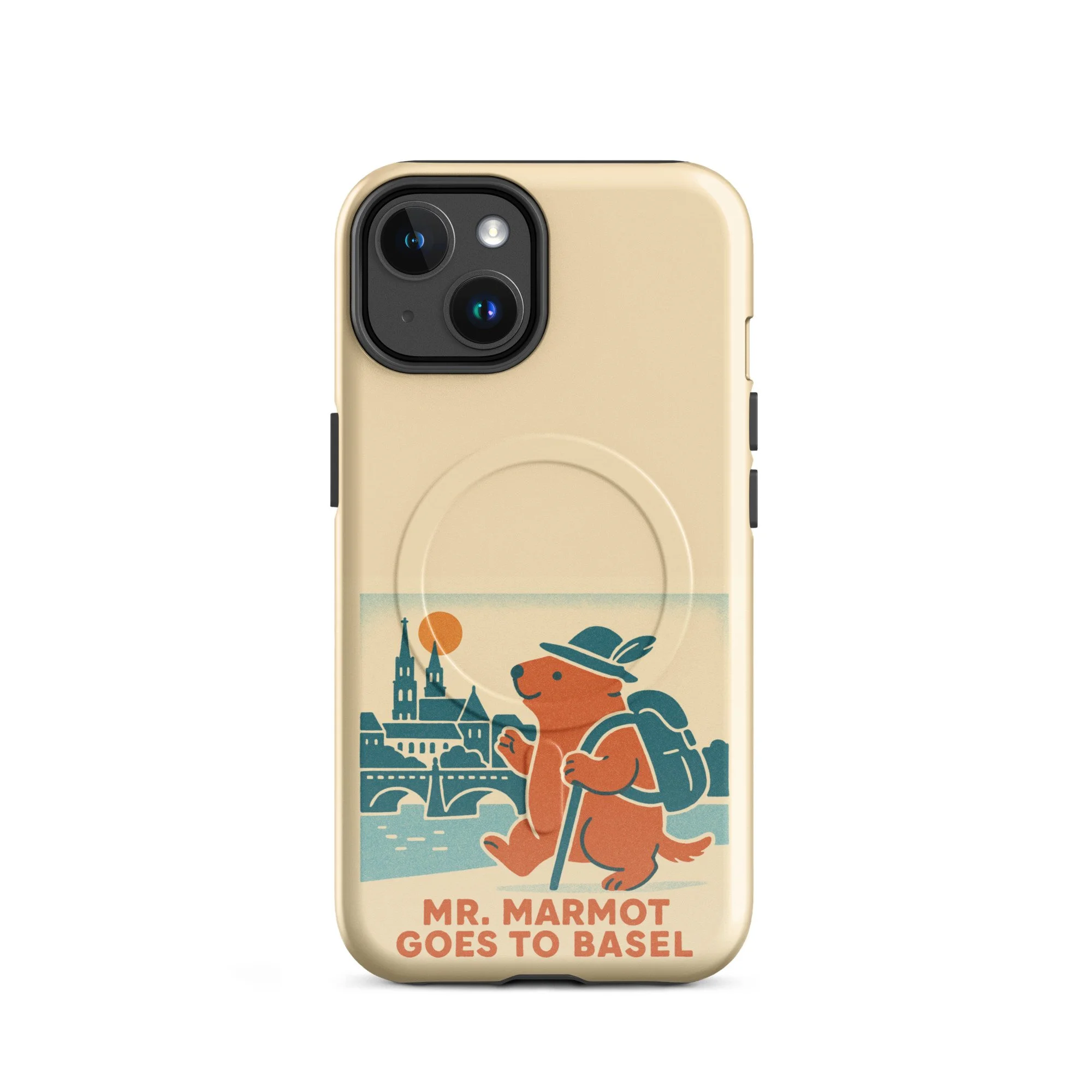 The Rhine, the Münster, and Mr. Marmot — on your iPhone. This MagSafe-compatible case features the charming retro illustration of Mr. Marmot striding along the riverbank with the cathedral and Rhine bridge behind him, in the warm cream, teal and burnt orange palette of the series.
