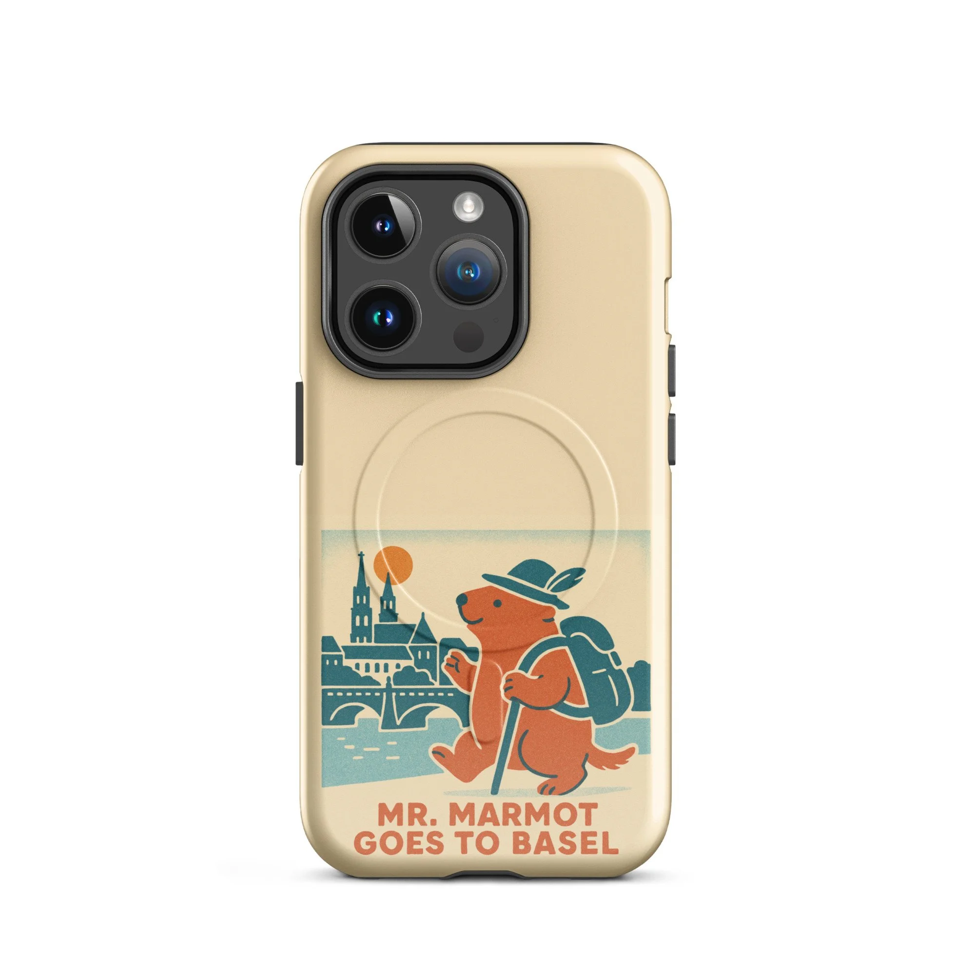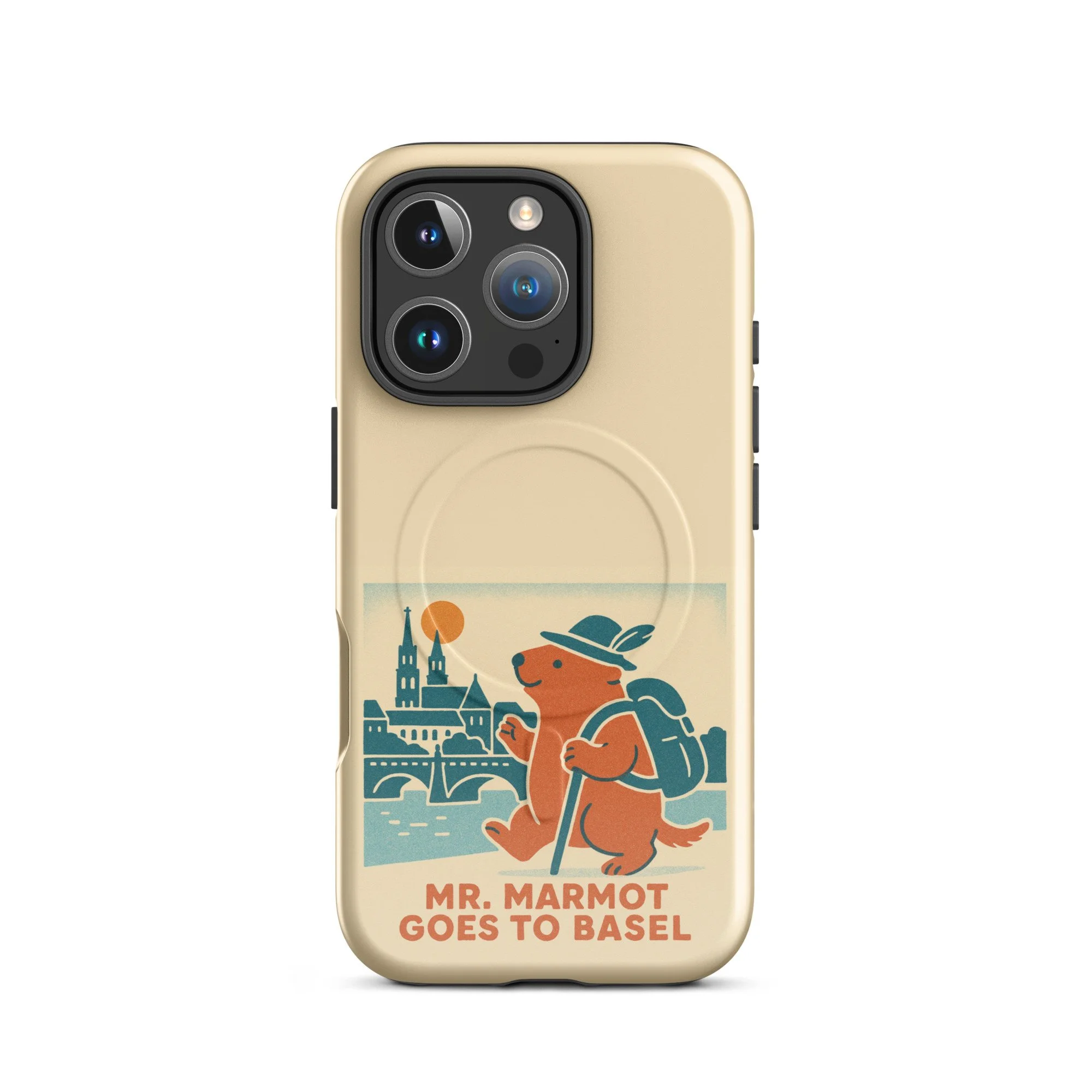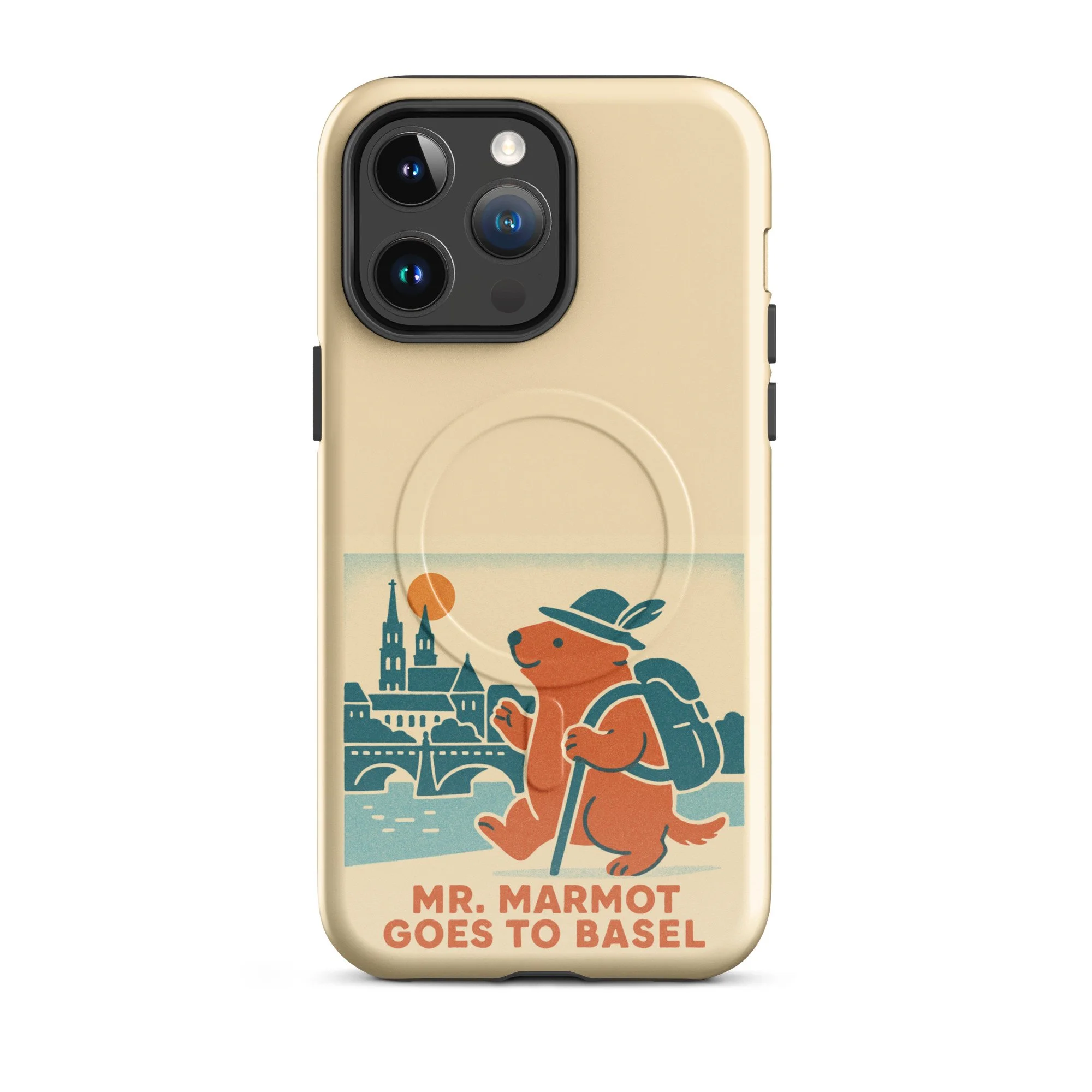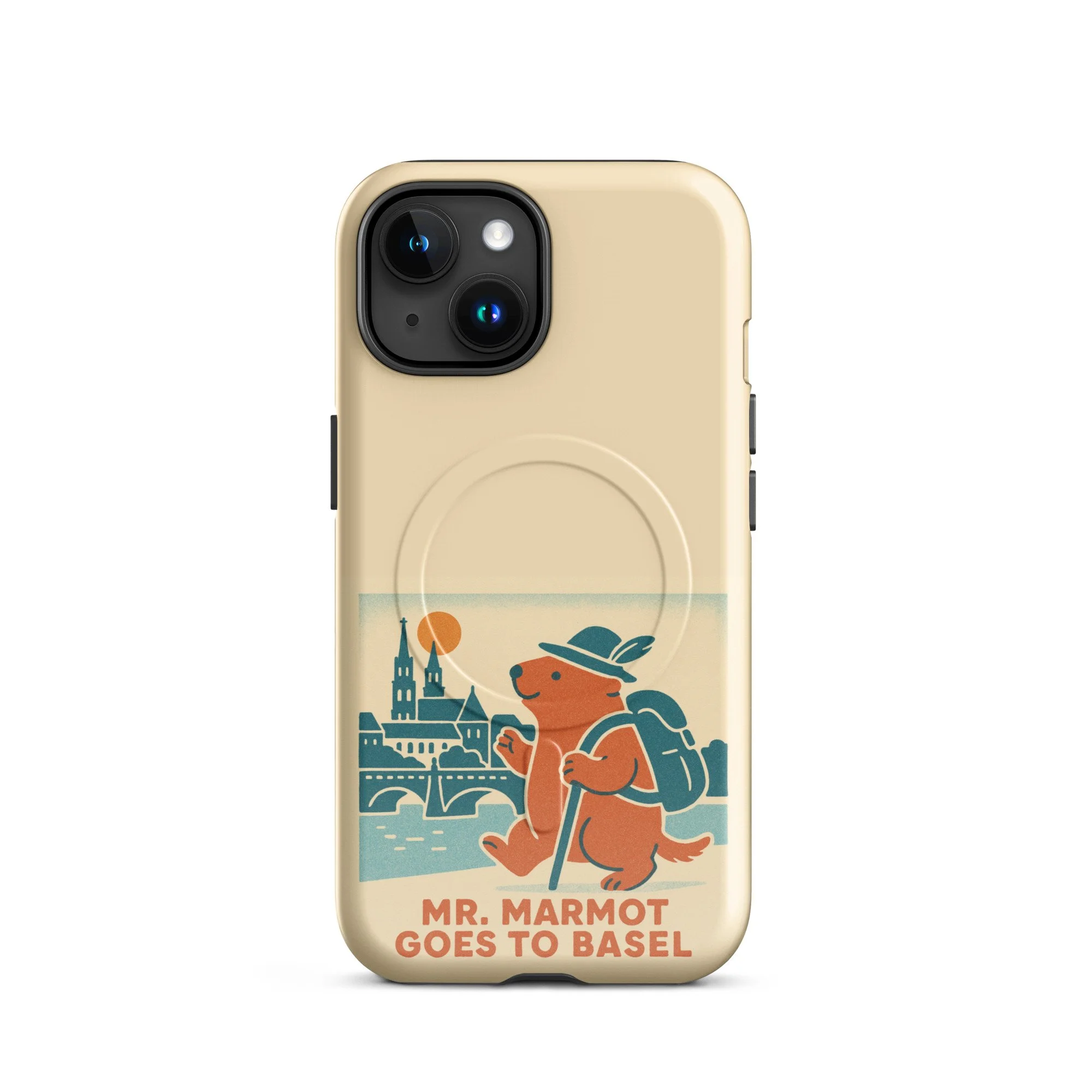 The Rhine, the Münster, and Mr. Marmot — on your iPhone. This MagSafe-compatible case features the charming retro illustration of Mr. Marmot striding along the riverbank with the cathedral and Rhine bridge behind him, in the warm cream, teal and burnt orange palette of the series.